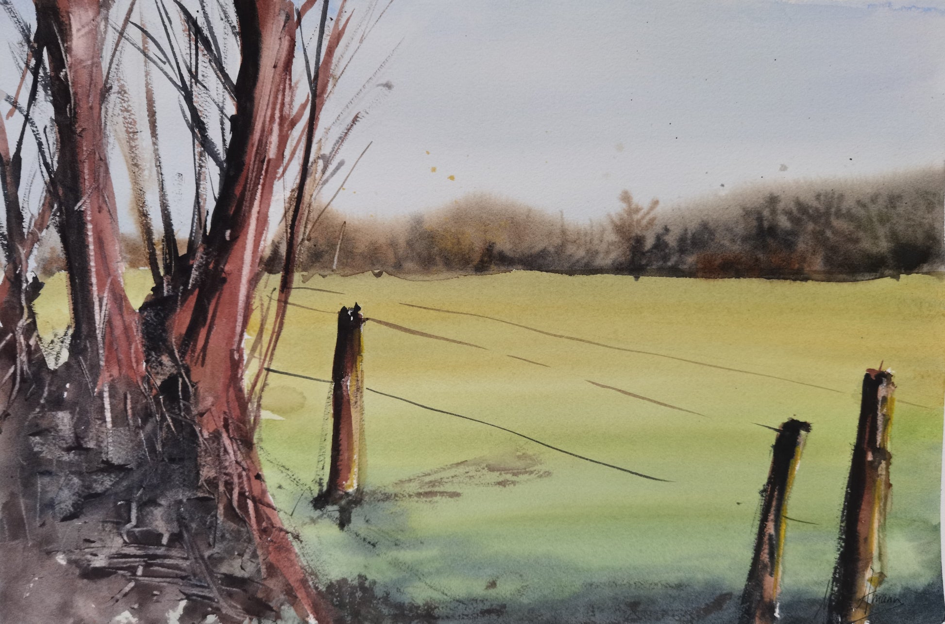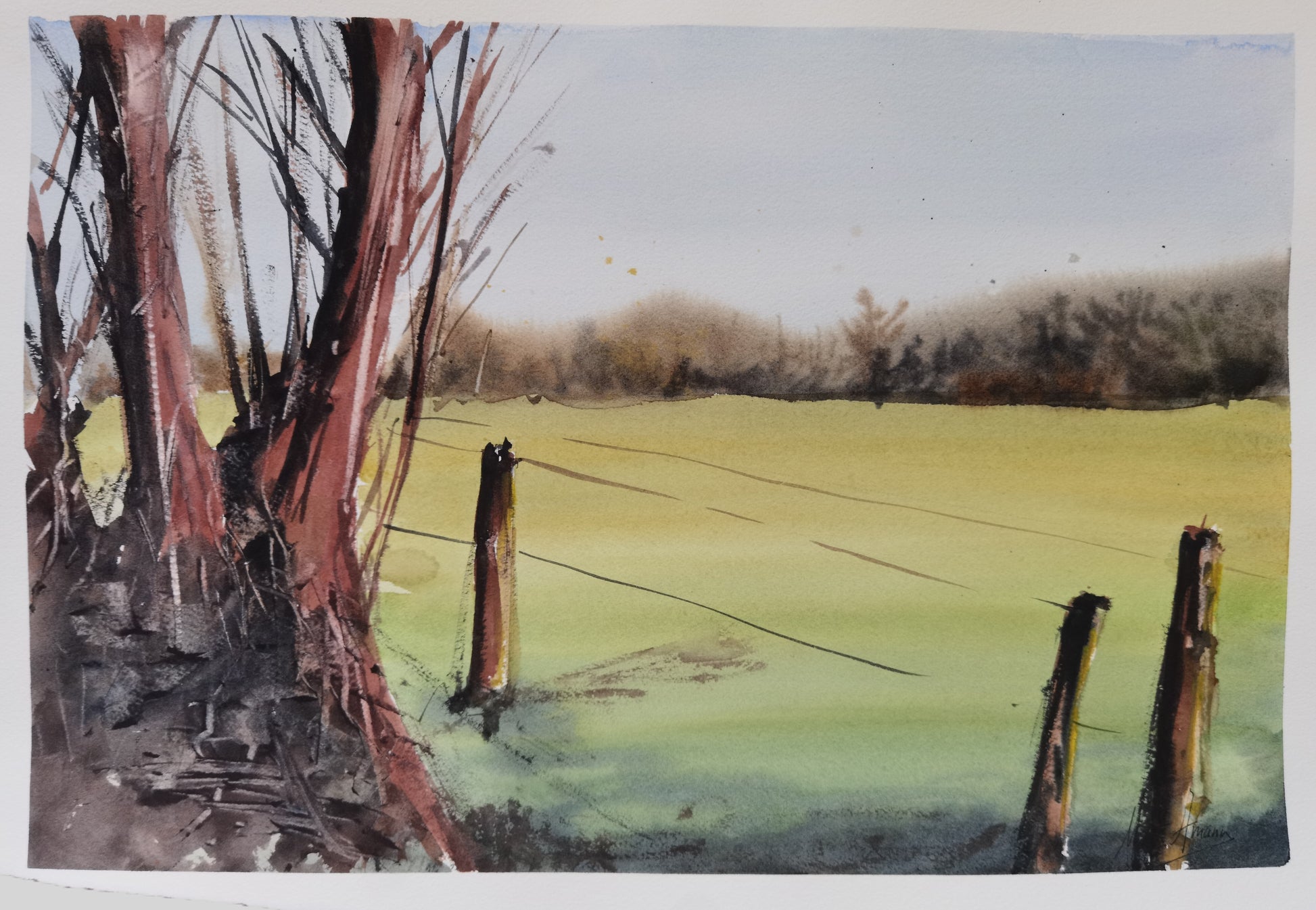 In this watercolor titled "In the Countryside," Marta Amann offers us a rural scene with a tranquil and restrained atmosphere. To the left, tall, bare trees stand elegantly, while a simple wood and wire fence runs diagonally across the composition, marking the boundary between the foreground and the open expanse of the landscape. The field, painted in muted greens and soft yellows, fades into the distance among mists and hills, beneath a slightly overcast sky.