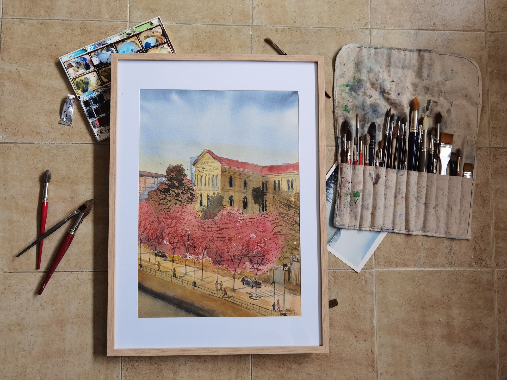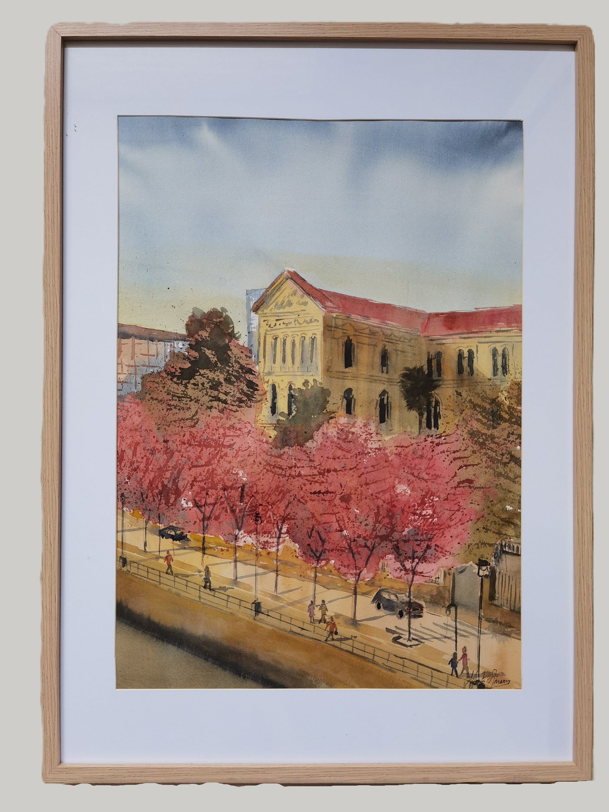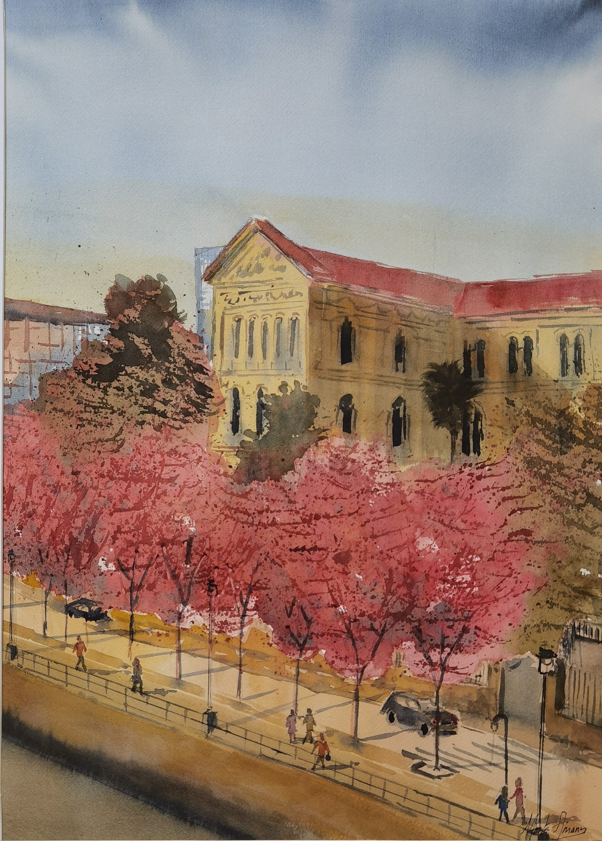 This work elegantly captures the urban character of Bilbao. The central building, made of light stone with a reddish roof, rises with a serene presence, evoking an institutional architecture steeped in history. The arched windows and ornamental details suggest a public function, while the row of flowering trees adds a vibrant counterpoint, as if spring were trying to soften the solemnity of the stone.
