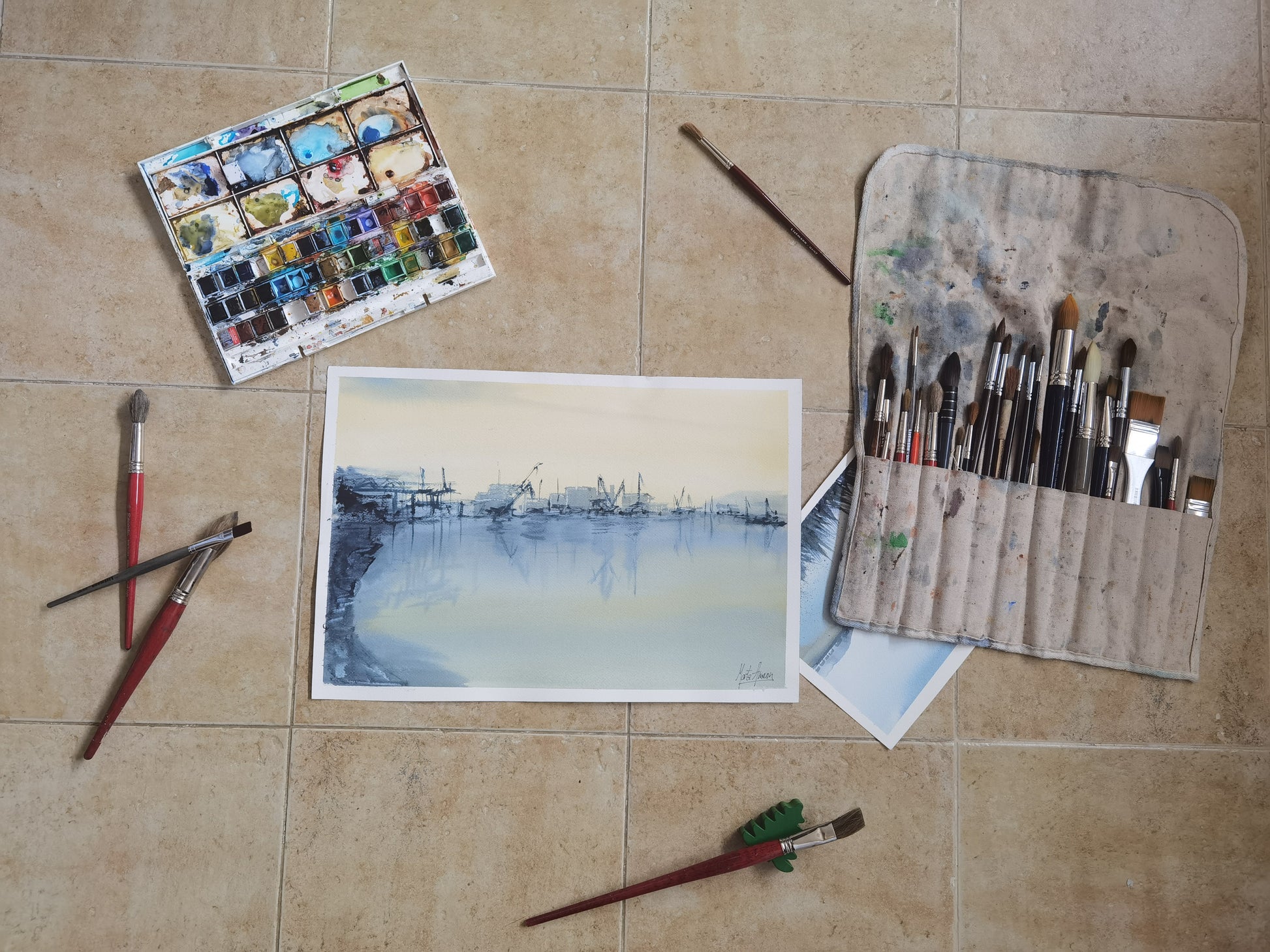 The watercolor captures that moment when the day is just beginning or already ending, and everything seems to be on pause. The port structures, the ships, the silhouettes of cranes and warehouses are reflected in the water with a delicacy that transforms the harsh into beauty. This is the working-class Bilbao, the one that built the city, the one that left its mark.