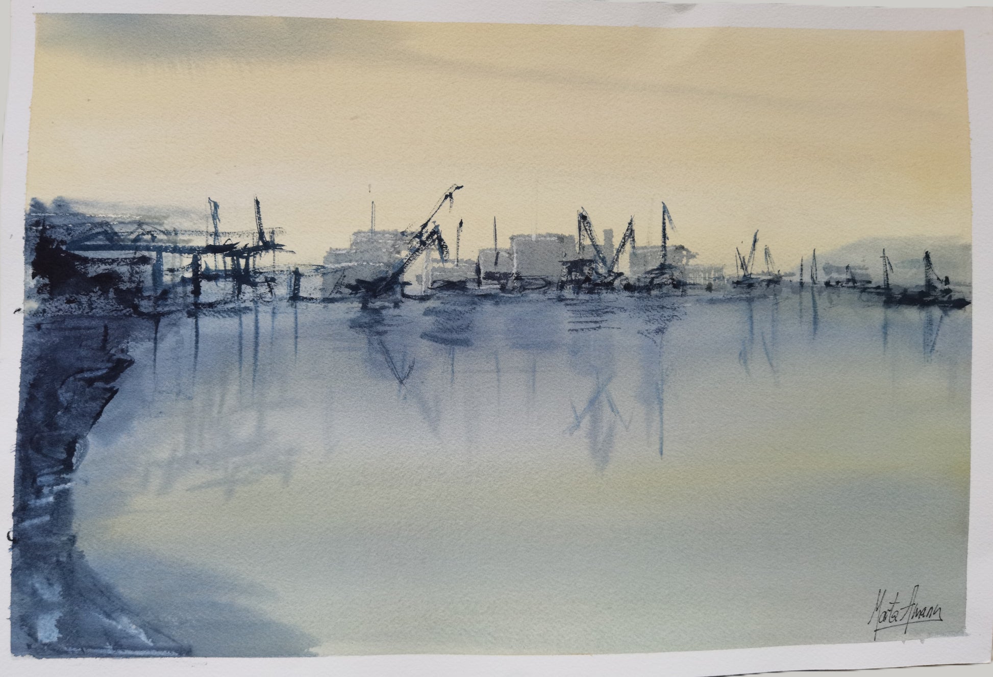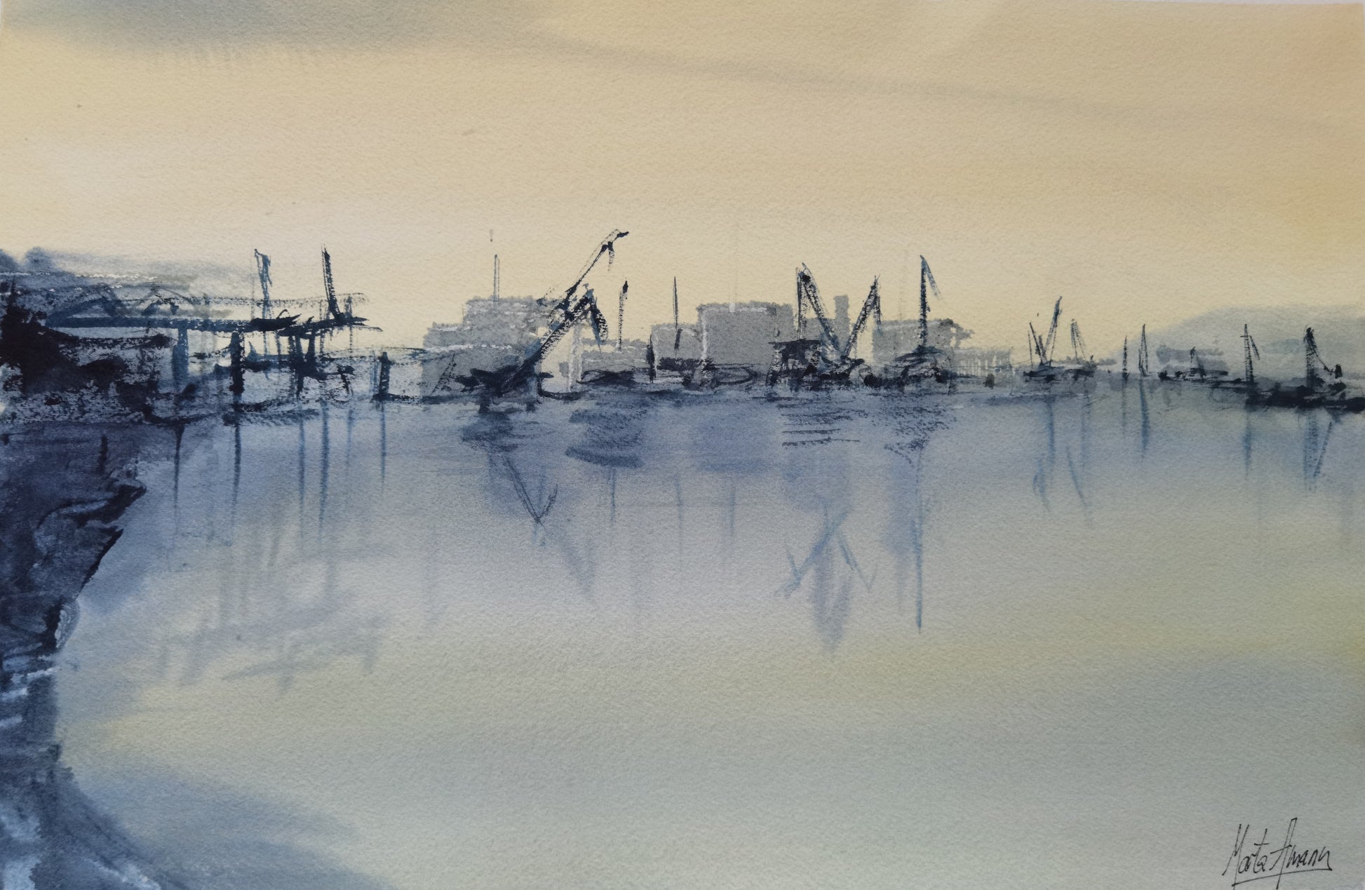This work is a silent tribute to the Bilbao that once was, the one that can still be felt in the docks, in the sleeping cranes, in the reflection of the factories on the estuary. Marta Amann paints with respect and tenderness an industrial landscape that, far from being cold, becomes poetic in the soft light of dawn or dusk.